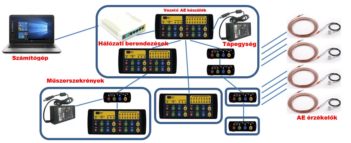 Sensophone AED404 / AED416 AE készülékeken alapuló folyamatos monitorozó rendszer fő részei: